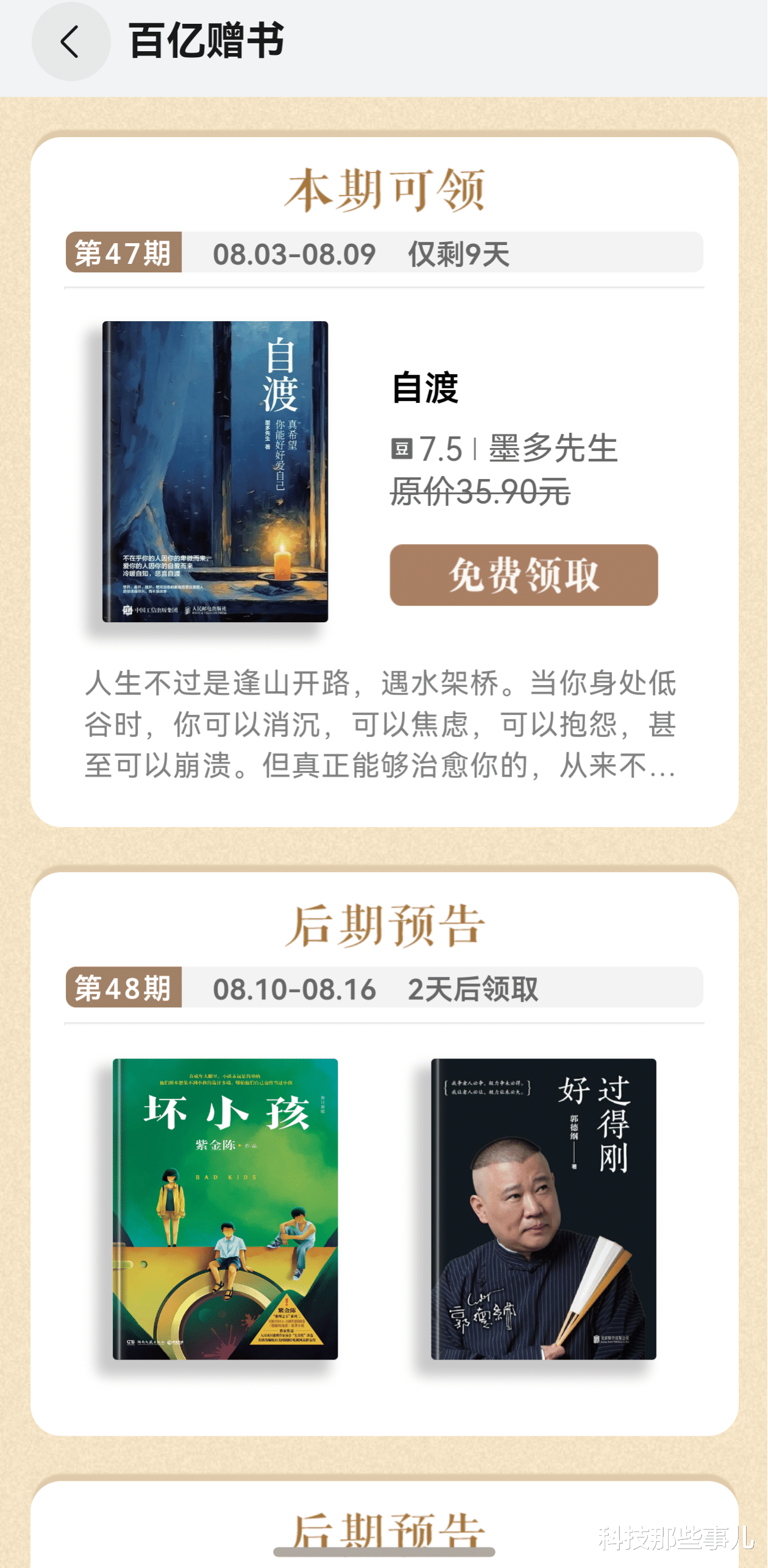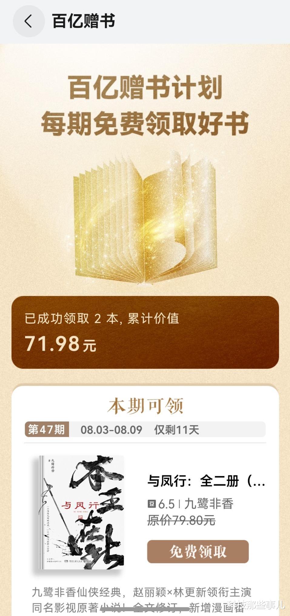 对了,还有一个宝藏活动一定要分享给大家,就是华为阅读的“百亿赠书计划”。每周都能在里面免费领到一些口碑很好的书籍,从畅销小说到社科历史都有,领了就是自己的了,还能一键分享给朋友一起读。