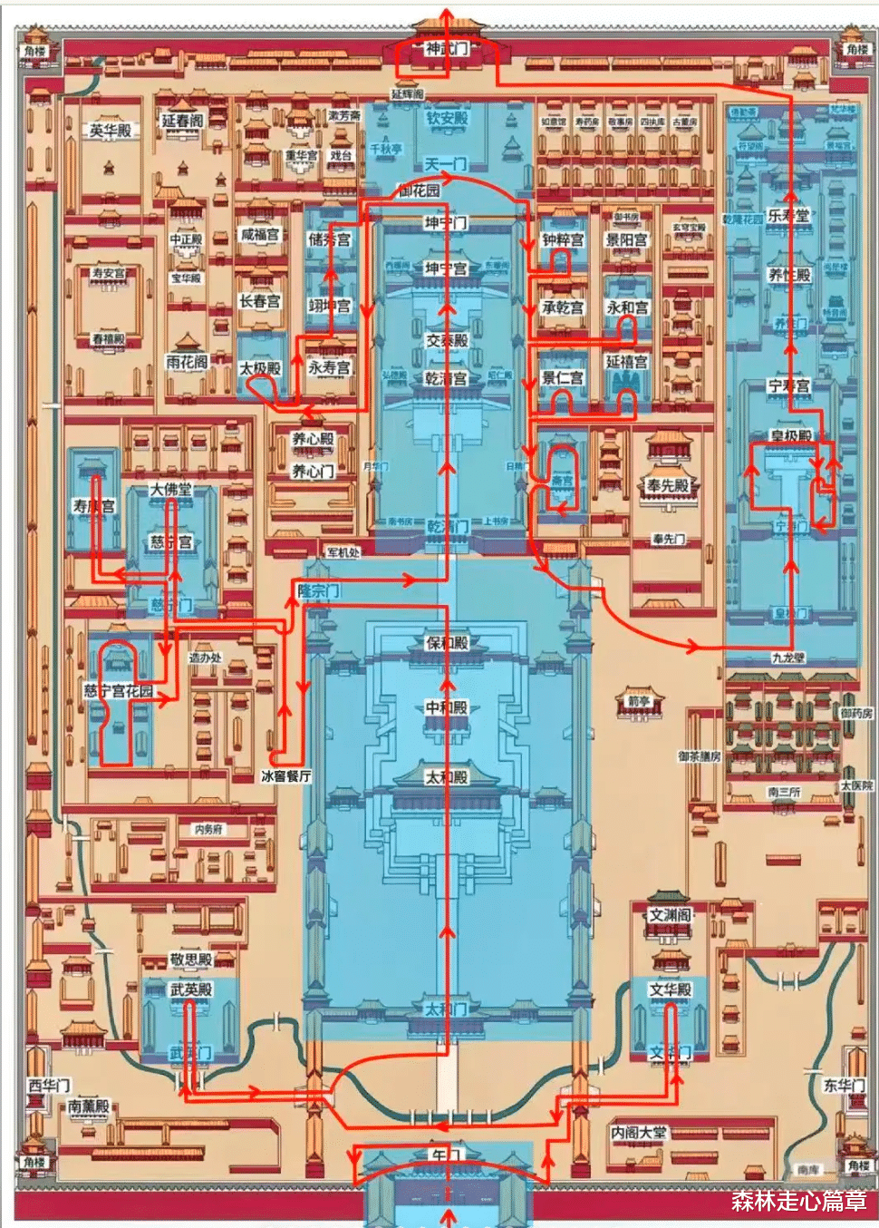 v路线:午门→太和殿→中和殿→保和殿→乾清宫→坤宁宫→御花园→珍宝馆→神武门。