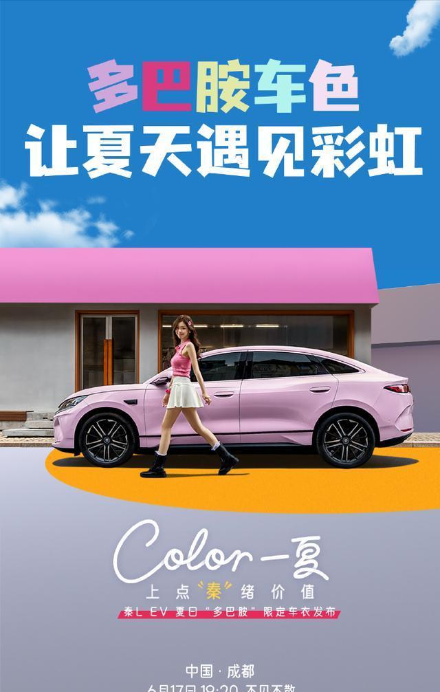 眼下,比亚迪秦L EV要搞事情了,6月17号推出夏日“多巴胺”限定车衣,粉、绿、蓝,这大胆的配色,你敢穿上身吗?