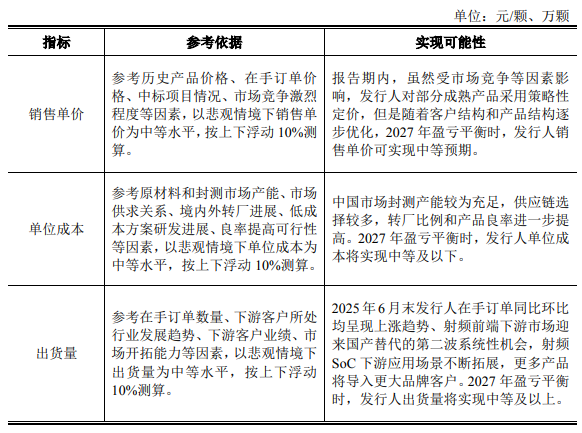 公司预计2026年实现盈利,预计毛利率在现有基础上稳步提升,达到盈亏平衡状态时(即最早于2026年)综合毛利率预计提升至22%以上,报告期内,公司的综合毛利率为17.06%、20.08%和20.22%,同时,预计跌价准备比例、跌价转销比例分别为13%、40%,报告期内则为14%-29%、43%-58%;公司预计达到盈亏平衡状态时(即最早于2026年)期间费用率将控制在20%左右,报告期内,公司期间费用率分别为44.25%、30.95%和23.55%,2024年大幅下降主要系通过降低研发、销售及管理人员薪酬。