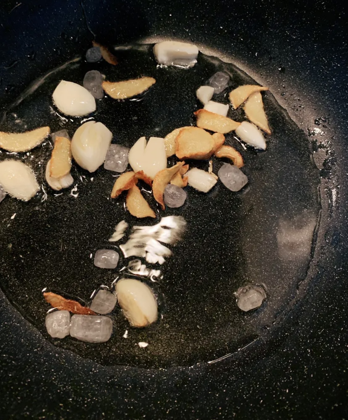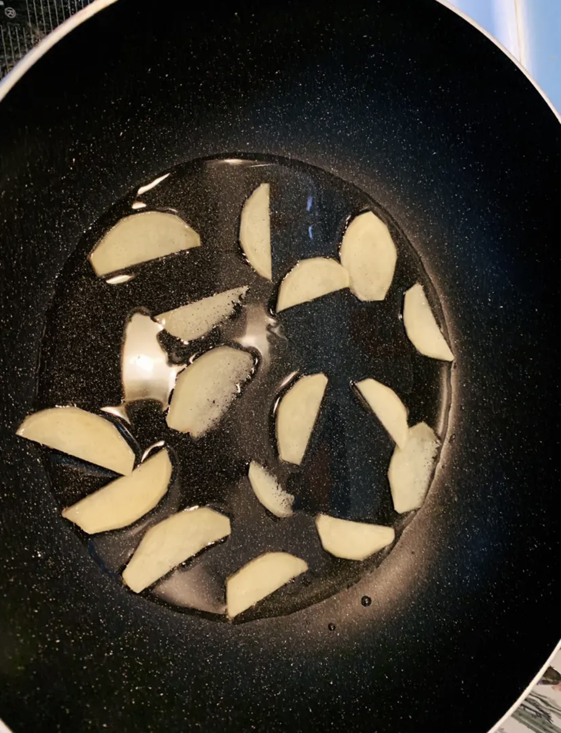 开火,油烧热,先放入姜片油煎,煎至四周微焦