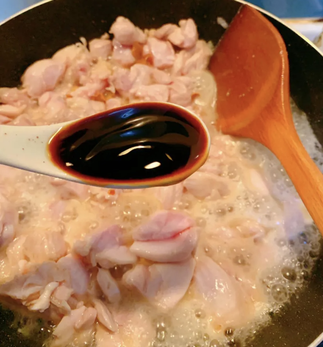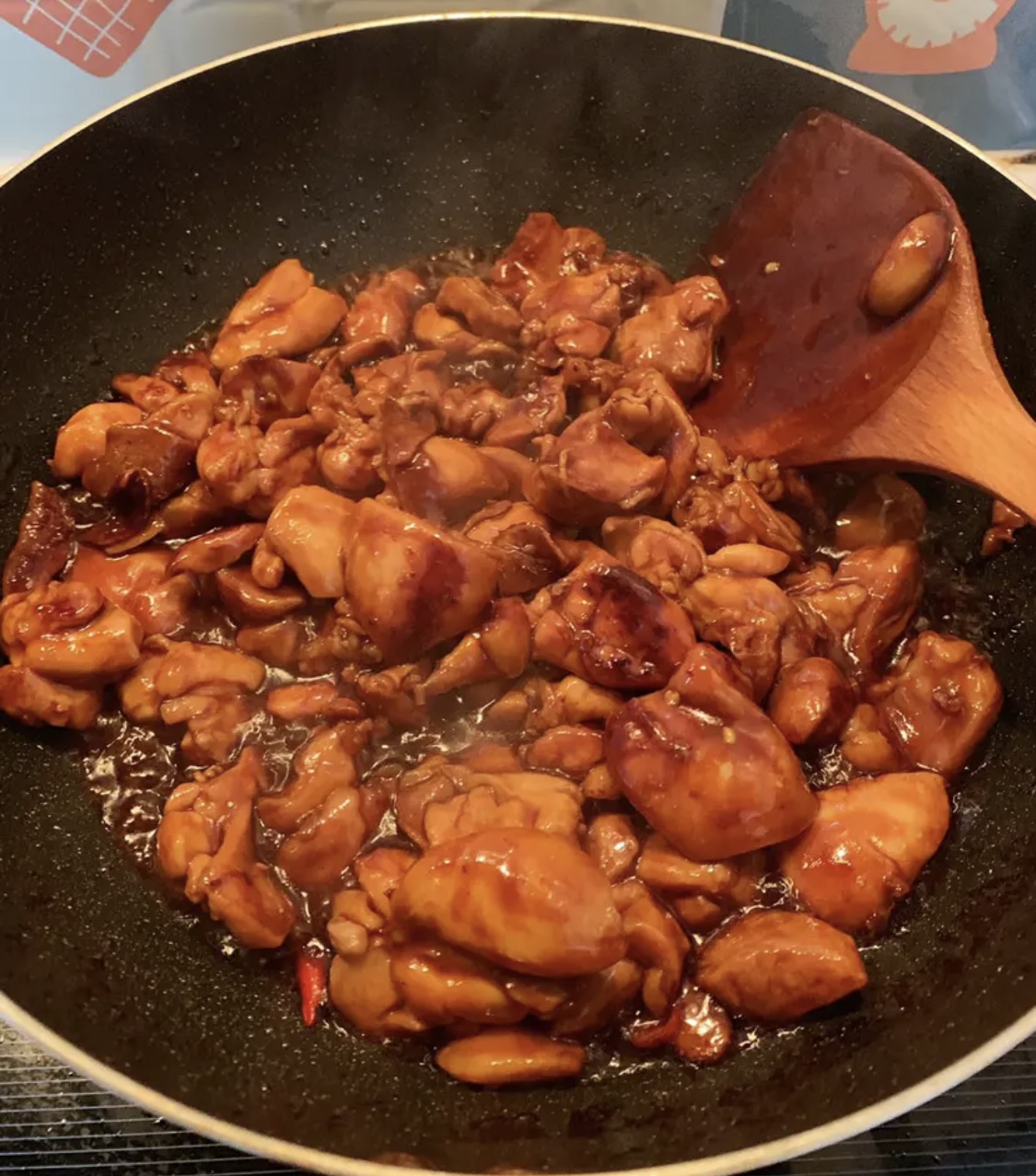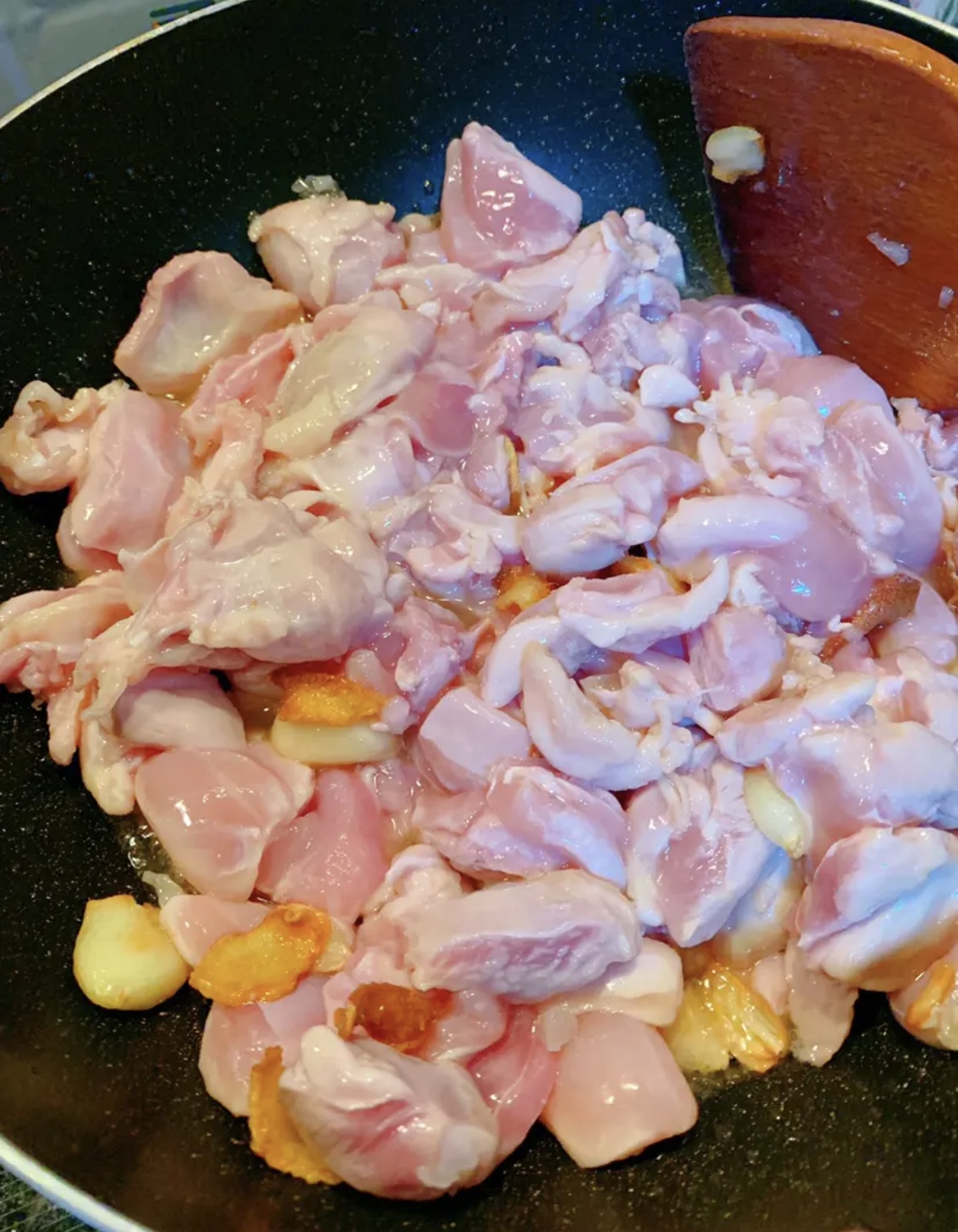 整个过程不放一滴水,完全靠米酒和鸡肉本身的水分煮熟。