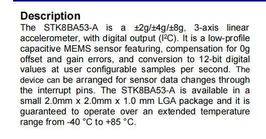STK8BA53-A采用紧凑的2.0mm×2.0mm×1.0mm LGA 封装,体积小巧,非常适合空间受限的移动设备。同时低功耗设计,正常运行时电流仅约110μA,休眠模式更低至1μA,极大延长电池续航,让你的设备更持久。