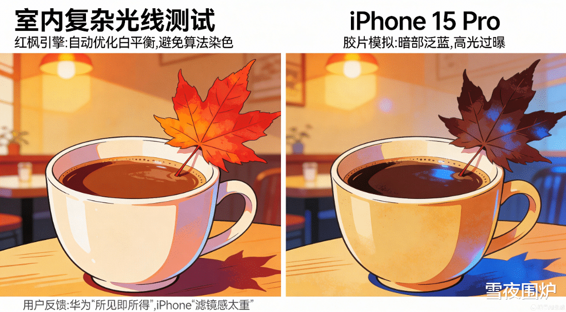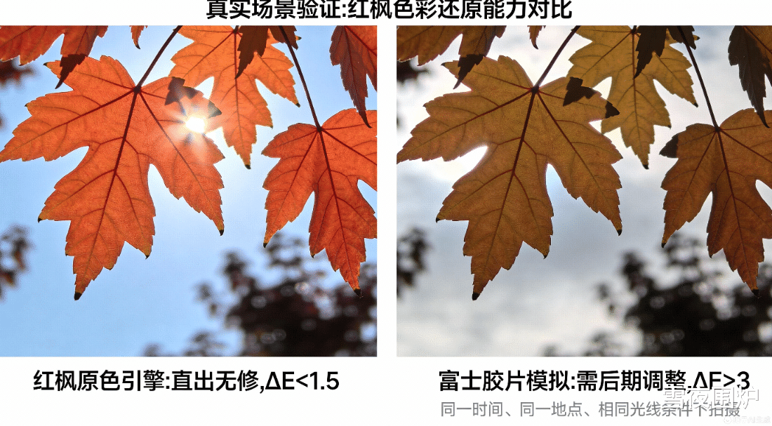 红枫引擎以硬件级精度“碾压”软件模拟,尤其在复杂光线(如蓝调时分)下,色差控制领先一代15。