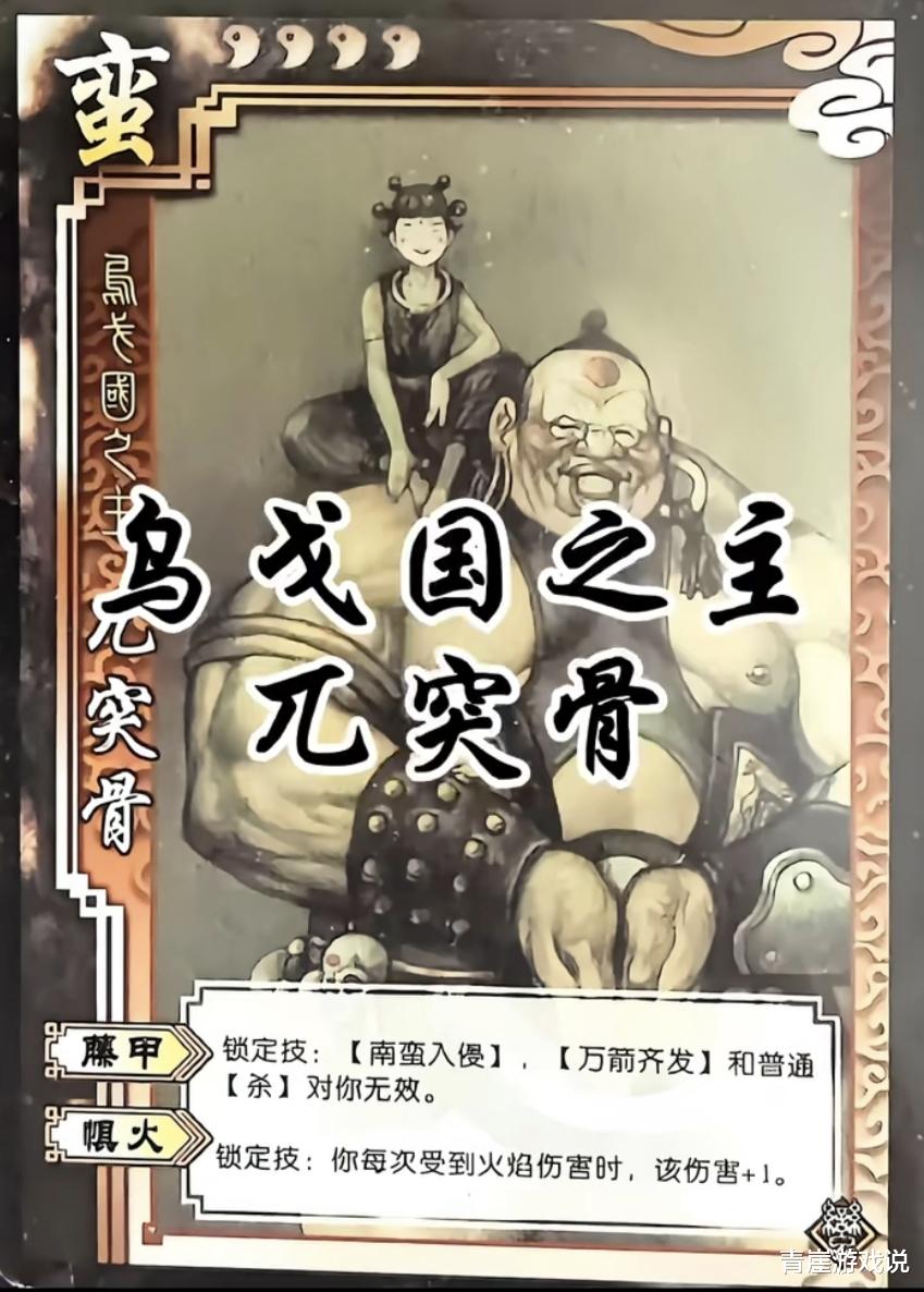 兀突骨的一技能【藤甲】具备了非常多的正面防御,直接免疫掉三种常规的伤害牌,和装备的藤甲完全一样,不过这是没有了负面的藤甲。