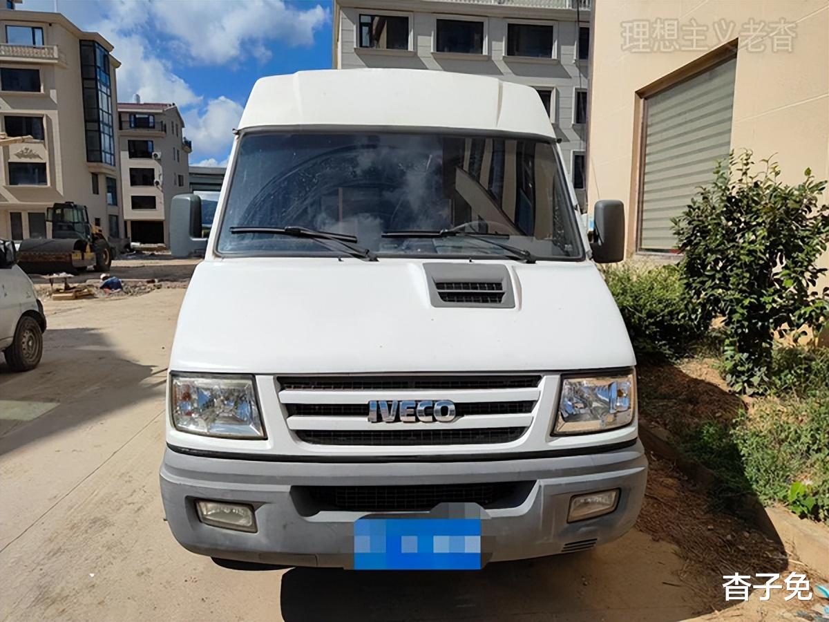 这是一台依维柯得意,柴油2.5T 排量,5挡手动,3门7座,独特的1+3+3座椅布局,无中门只能从右前门进入室内,通身大白色原车漆,引擎盖上的进风口是其明显标识。
