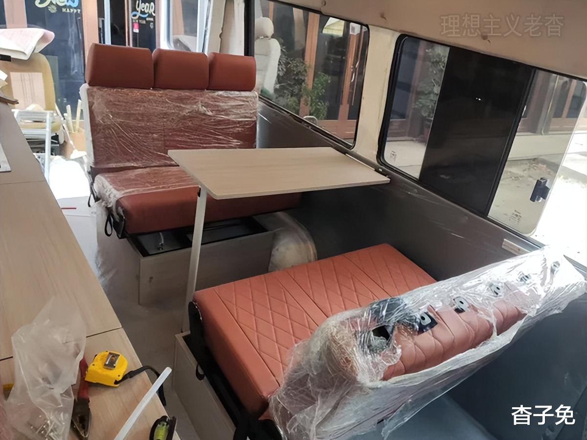 进入室内,中后排座椅换成了床车专用椅,中排座椅已向后翻转,与后排形成对座,中间添置了一张简易折叠桌,组成车载小客厅,是日常喝茶吃饭与学习办公的地方。