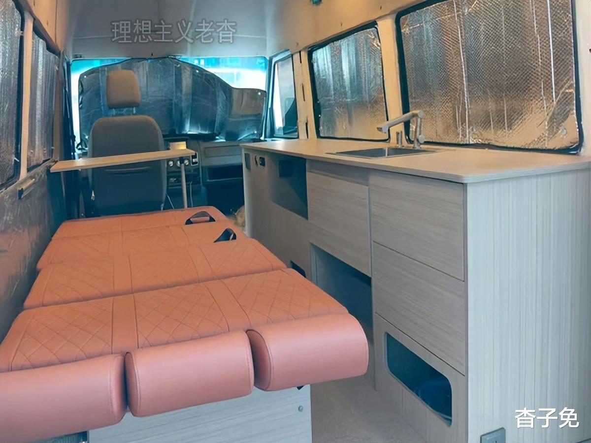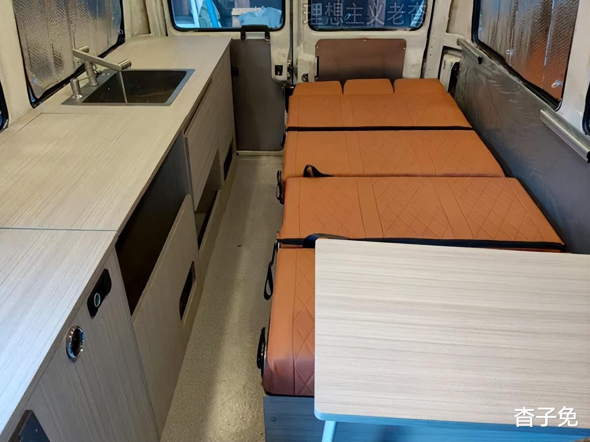 床铺右侧是靠窗厨柜,纯实木打造,储物空间众多,下面可放水电和炊具,上面有洗菜池,带上食材就可在车内做饭。