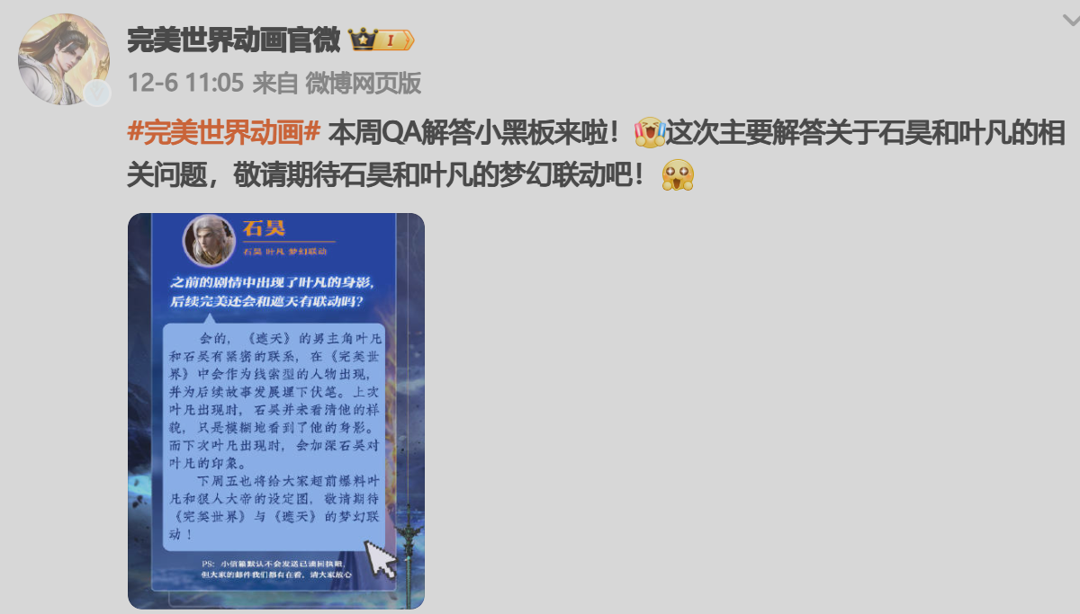 近期,《遮天》与《完美世界》这两大鸿篇巨制犹如双子星辰,在浩瀚的文学宇宙中璀璨联动,官方微博宛如桥梁,热情回应着万千粉丝对石昊与叶凡这对跨界英雄的热烈讨论。尽管它们源自不同的创作工坊,但辰东大神以他那无与伦比的笔触,勾勒出一个跨越时空、交织命运的宏大世界观,让两部作品血脉相连。