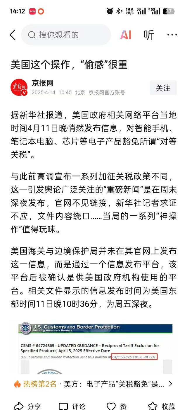 在豁免清单里面的商品可以免除百分之一百四十五的关税,这就像是美国将大门紧闭,却又开了一道口子,希望能够得到缓解。这样一来,中国或许也会对美国进行让步,让这九十艘的货船顺利的来到美国的商人手中,让他们的利益不受到损失。