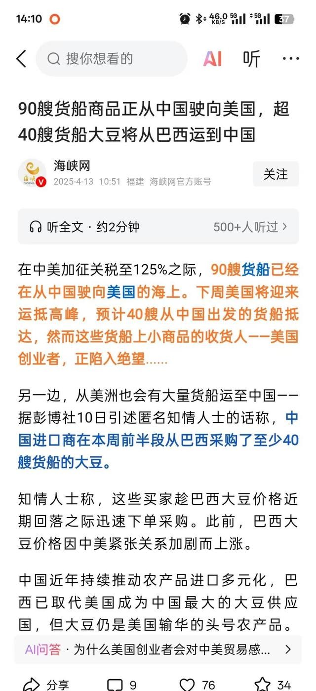 信息源:海峡网发布的“90艘货船商品正从中国驶向美国,超40艘货船大豆将从巴西运到中国”的报道。