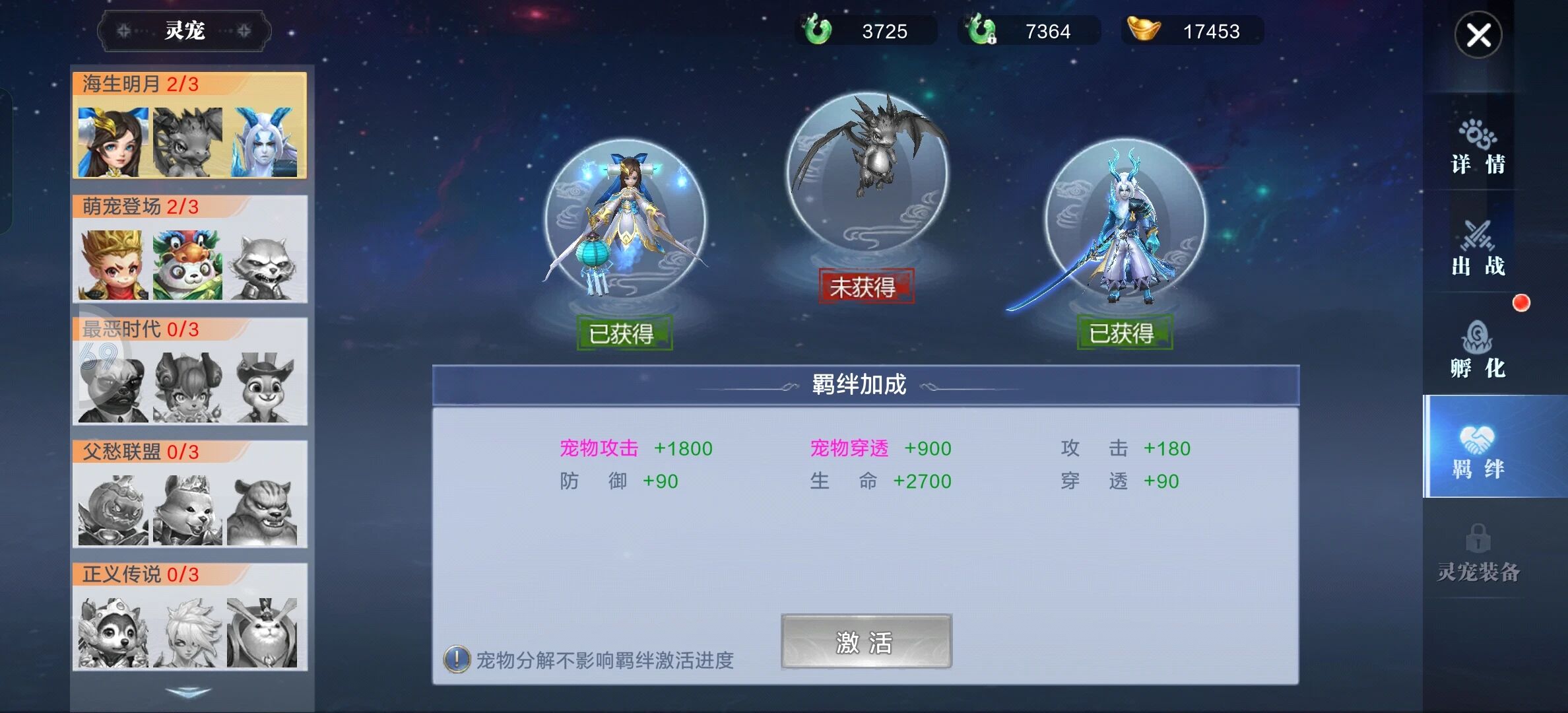 宠物从不是单打独斗的 “孤勇者”,而是能联动触发 **“羁绊增益”的 “战力天团”!当你收集到 “海生明月”“萌宠登场” 等指定组合的宠物时,不仅宠物自身的攻击 + 1800、穿透 + 900、生命 + 2700会直线飙升,连角色的攻击、穿透、防御 ** 也会同步暴涨,相当于养宠直接给角色 “叠了层超强 buff”!副本冲层、跨服 PK 时,羁绊激活的瞬间,战力 “哐哐” 上涨,碾压对手的爽感直接拉满~