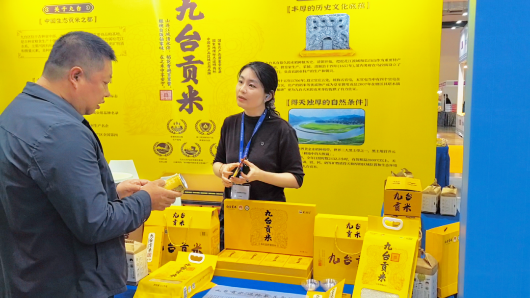 九台贡米的展台凸显了东北农产品的质朴厚重,陈列其上的九台贡米颗粒饱满、色泽莹润,刚一亮相便牢牢吸引了过往参观者的目光,不少人纷纷驻足停留,对这款来自东北的贡米产生了浓厚兴趣。工作人员则耐心细致的进行讲解,从九台贡米生长所依赖的肥沃黑土、适宜气候,到传承多年的传统种植技艺,再到产品的营养成分与适配的烹饪场景,全方位、多角度地向参观者解读九台贡米的核心竞争力,不少人在听完介绍后,都对九台贡米这个品牌产生了浓厚兴趣。
