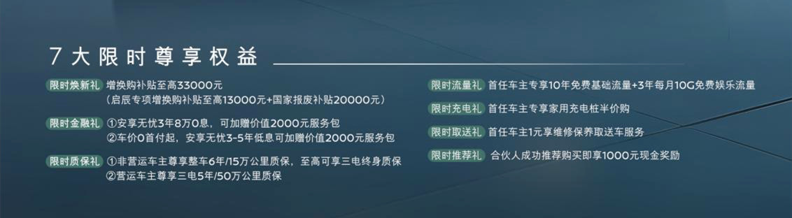 特别值得一提的是,消费者即日起下订并于2025年8月31日(含)前交车,可享全方位权益。具体包括:非营运车主尊享整车6年/15万公里质保,至高可享三电终身质保;首任车主专享10年免费基础流量+3年每月10G免费娱乐流量;增换购补贴至高33000元等。