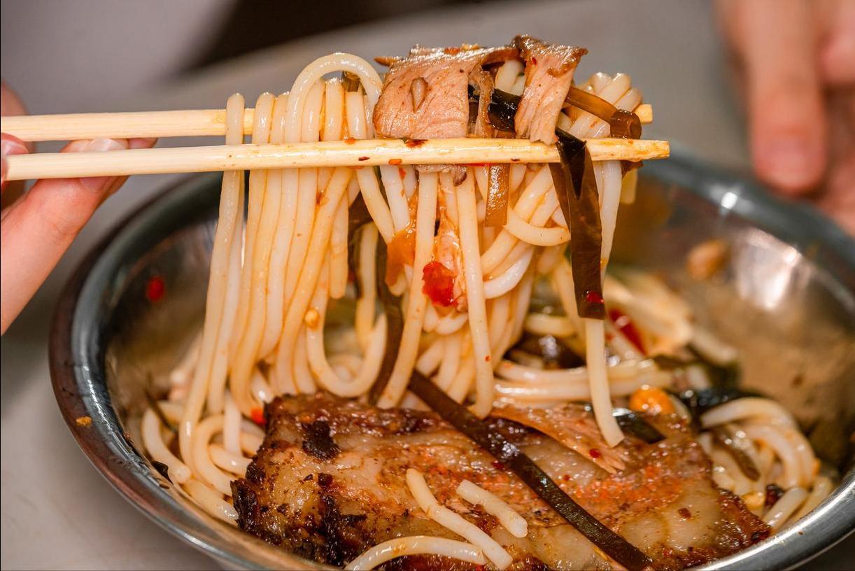 淋热卤水,撒酸豆角、锅烧片,再搭黄豆与辣椒,酸辣咸香直钻鼻腔。