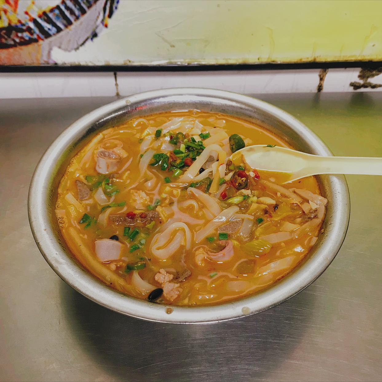 汤底以猪骨牛骨熬制,配肉丝、酸豆角等码子,鲜香浓郁。
