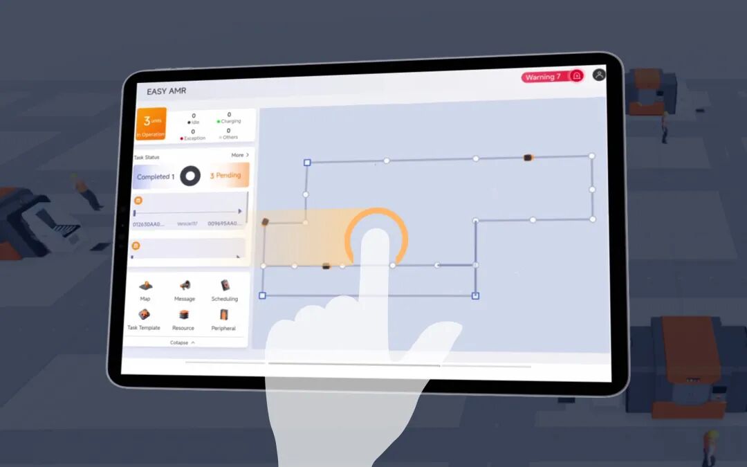 EasyAMR通过把移动机器人的硬件和调度系统软件深度整合,形成“硬件-软件-终端” 无缝配合的体系。以PAD作为移动终端,几步操作即可将AMR、调度管理软件以及充电桩等其他相关终端进行工厂内组网,帮助小微工厂和集成商降低设备部署成本,大幅提高项目效率,实现“开箱即用”。