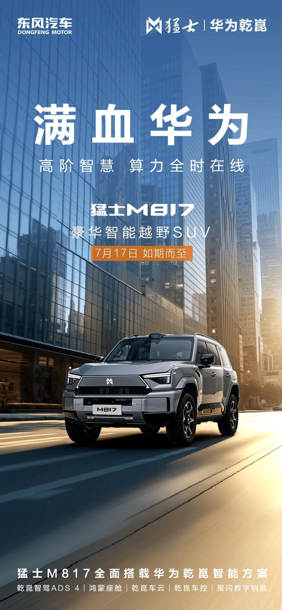7月17日,中国汽车工业将迎来一个重要时刻——东风猛士科技"风华正猛"技术发布会暨猛士M817预售启动仪式。这款定位40万级市场的豪华智能越野SUV,凭借"军工品质+华为智能"的双重基因,正在重新定义新能源越野市场的技术标准与价值体系。