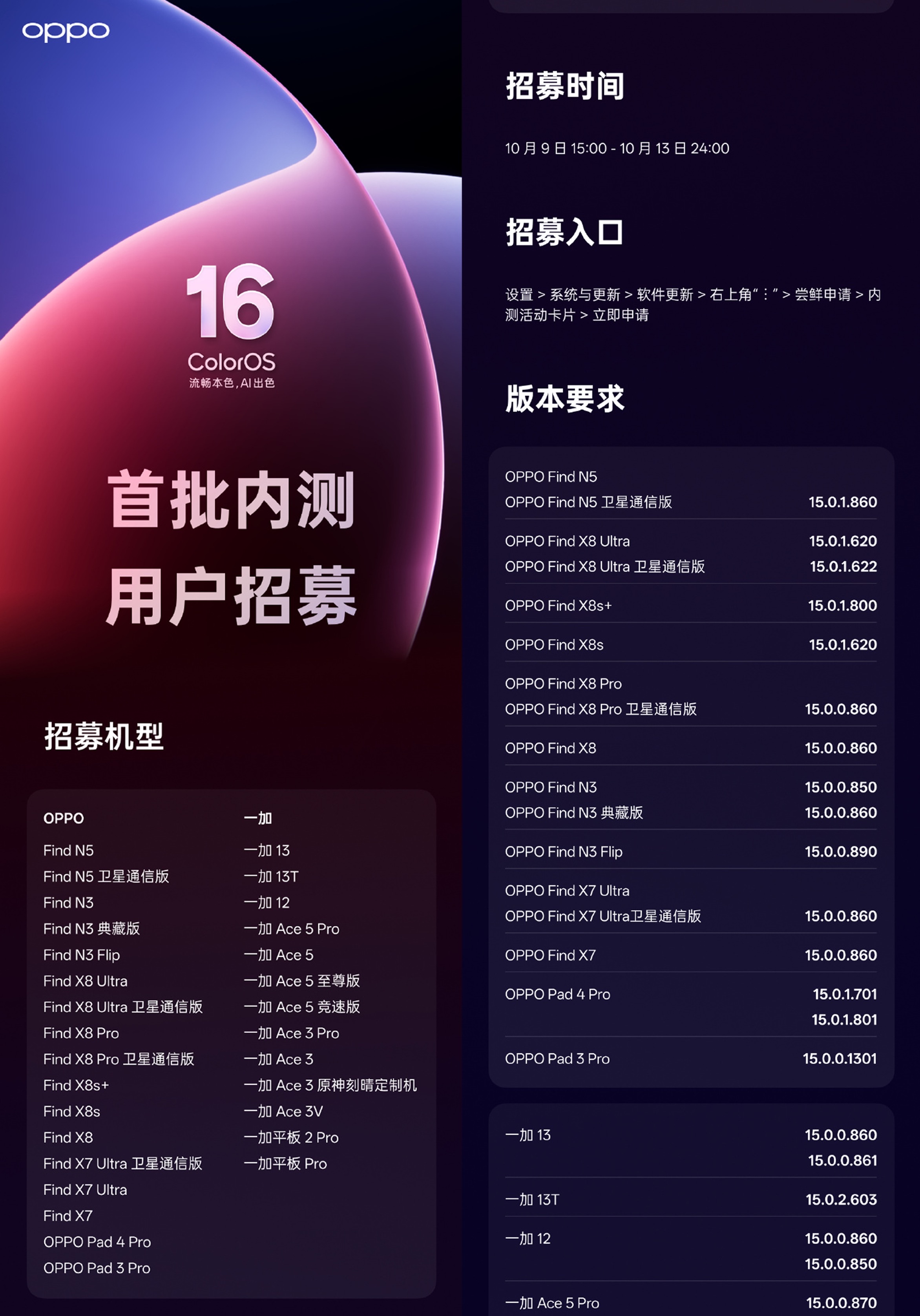 OPPO这次玩得有点大啊!刚准备关注Find X9系列发布会,结果发现新机首发搭载的ColorOS 16,直接给近30款机型开了内测通道!10月9日15点到10月13日24点开启招募,想升级的可别错过了啊!我手里的老Find X7都激动了,赶紧去后台看了眼,Find X8、Find X7这些系列基本都在名单里,连好多一加机型也能提前尝鲜,这覆盖范围真的史无前例。大致看了一下,这次ColorOS 16主打一个丝滑!我看官方演示的那个全新动效,应用切换、返回桌面都跟德芙一样顺滑,几乎看不到掉帧。还有很多AI功能也很有意思,相册里的AI人像补光功能,以后P图都省了。还有AI灵感主题,从锁屏到桌面,个性化编辑能力全面提升,更加美观耐看了。另外ColorOS 16的UI设计采用了全新光场设计,模拟真实光影变化,交互操作更加自然灵动!今年ColorOS16系统Find X9系列会首发搭载,反正如果你是看重系统流畅度的话,闭眼冲Find X9系列就完事了!