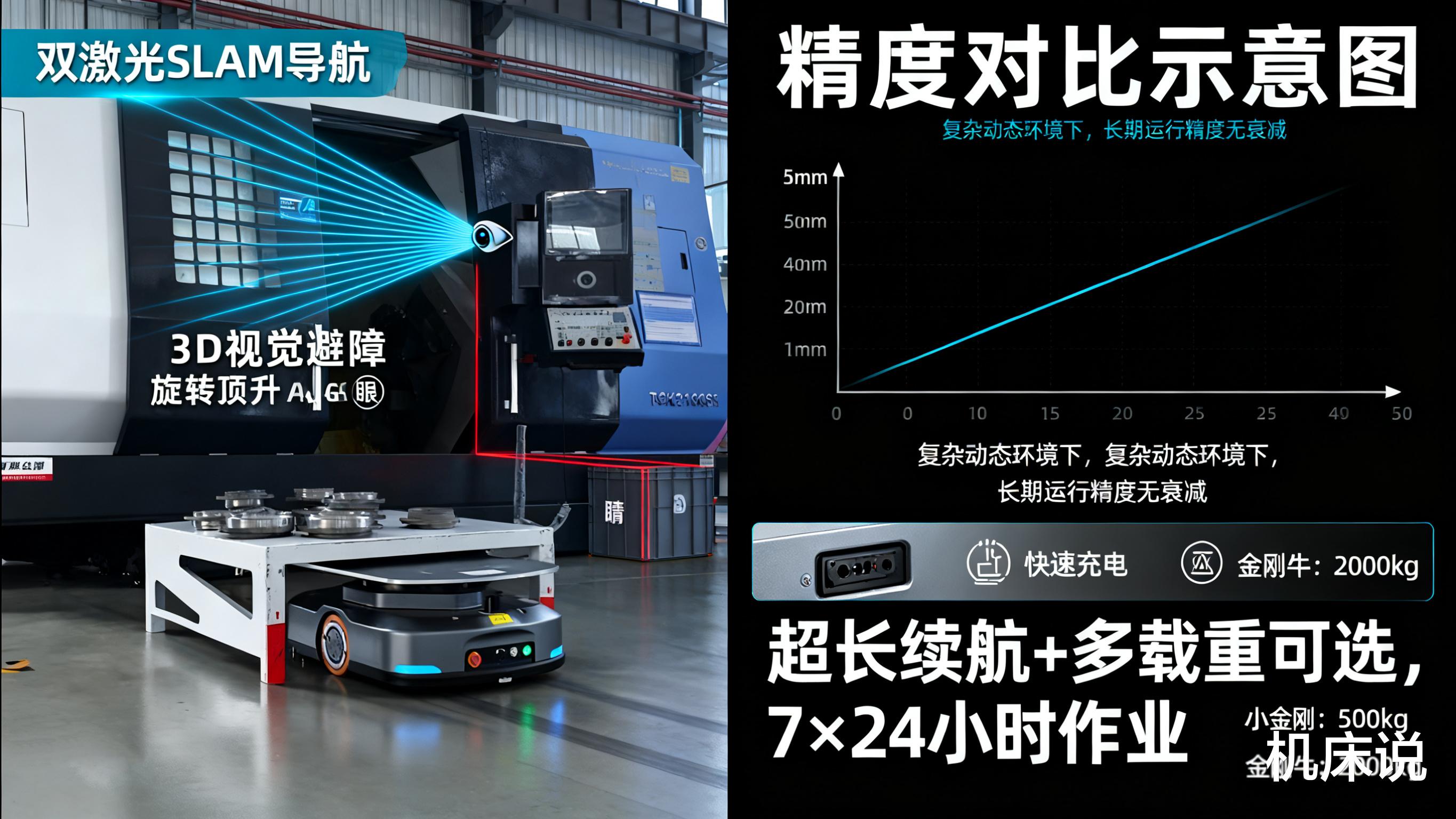 精度·可靠·安全:5mm高精度定位:采用双激光SLAM融合导航及3D视觉避障技术,即便在复杂动态车间环境中也能精准运行,规避偏位、碰撞风险。超长续航与强悍负载:克服普通AGV续航短板,轻松胜任高频率搬运;不同型号(如“小金刚”、“金刚牛”)满足从轻型物料到重型货物的多样化载重需求。7×24小时无间断作业:稳定可靠,长期使用精度无衰减,恶劣车间环境轻松驾驭。