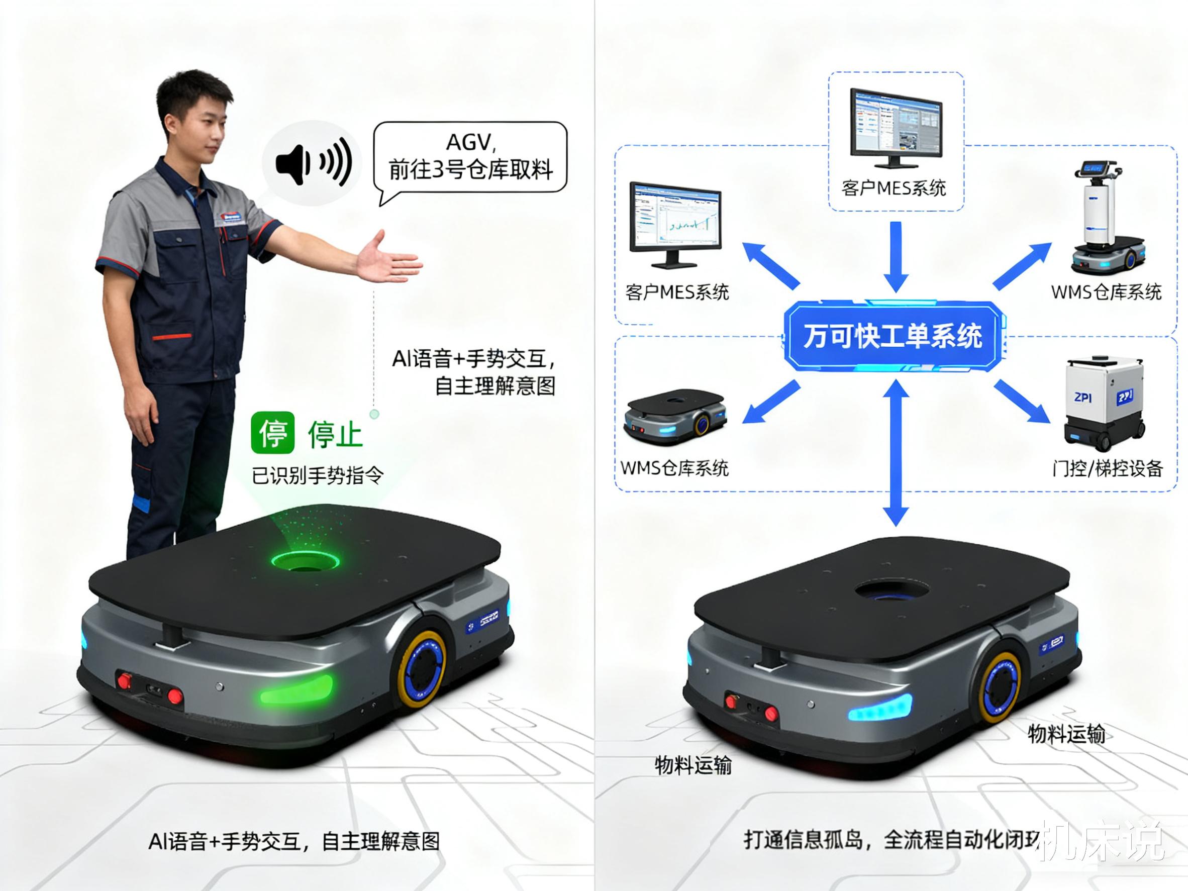 智能·柔性·协同:真正“AI”内核:突破传统AGV脚本化操作,支持智能语音控制、手势交互、意图理解、自主决策。可自主查询仓库状态,具备初步“具身智能”能力,理解环境并做出响应(如车辆跟随)。柔性适配大师:业内领先的自主研发调度系统,无缝对接多品牌控制器(。轻松匹配产线JIT节拍,实现物料精准配送与柔性生产协同。任务流程设置简单灵活,支持自动化、人机协同及贴场景预设流程,好落地才是硬道理。生态链融合专家:深度集成“快工单生产管理系统”,实现物料运输全流程自动化闭环管理。更可无压力对接客户现有MES/WMS/ERP系统及外围设备(门控、梯控),打通信息孤岛,避免推诿扯皮。