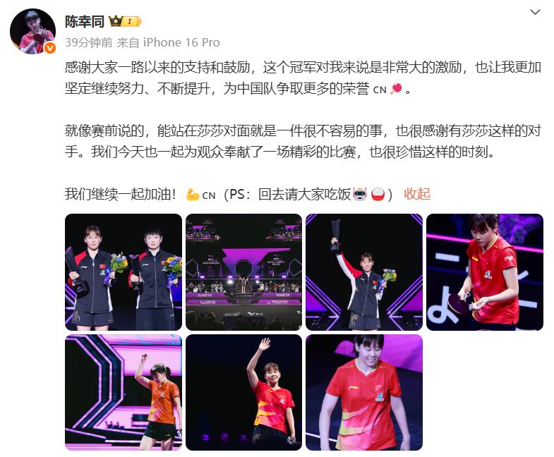 夺冠后她发的社交媒体,网上讨论得特别热闹。她在里面两次提到孙颖莎,说“能站在莎莎对面已是莫大荣幸”,还说胜利要感谢团队支持和对手激励。这态度,跟当天男单决赛张本智和形成了鲜明对比。张本智和第六局申请医疗暂停引了争议,赛后又脱衣庆祝,那天日本选手因为有争议的举动闹得舆论纷纷,而陈幸同一句“我们一起加油”,展现了另一种竞技态度。