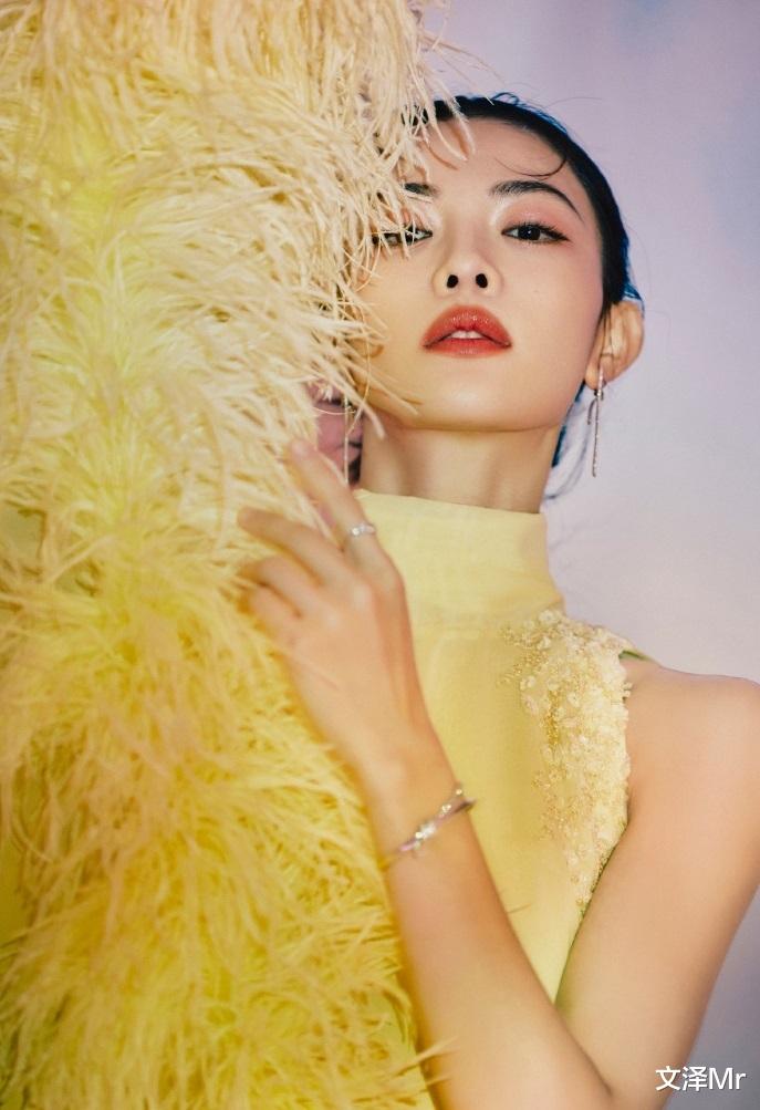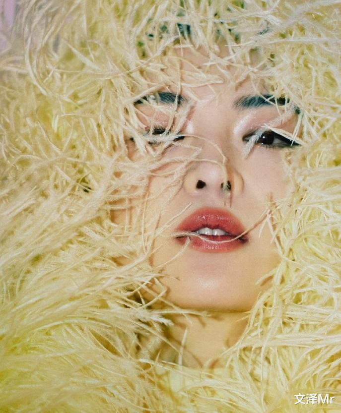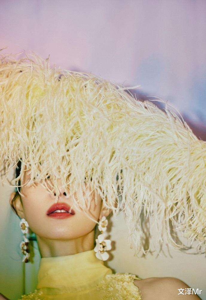 钟楚曦被鹅黄色的羽毛巧妙遮挡住部分脸庞,只露出那鲜艳欲滴的红唇和精致的耳饰。 鹅黄色羽毛轻盈且富有质感,为整个画面增添了一份神秘与梦幻的氛围,仿佛是从童话世界中走出的神秘公主。