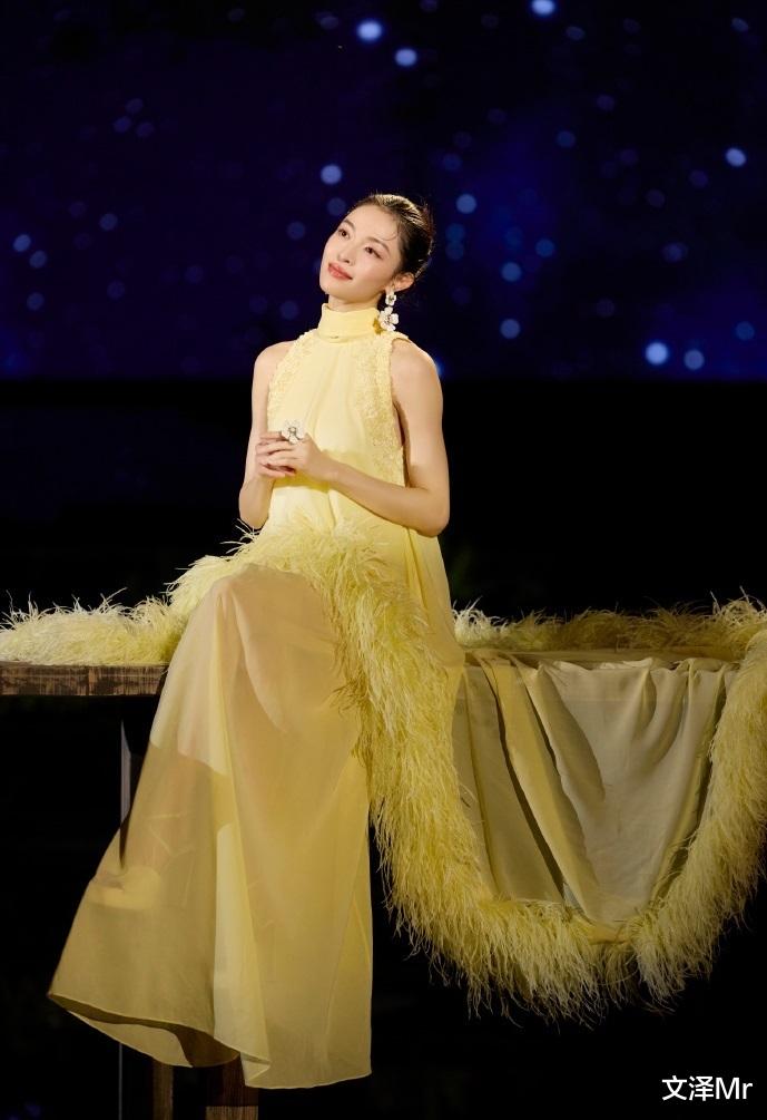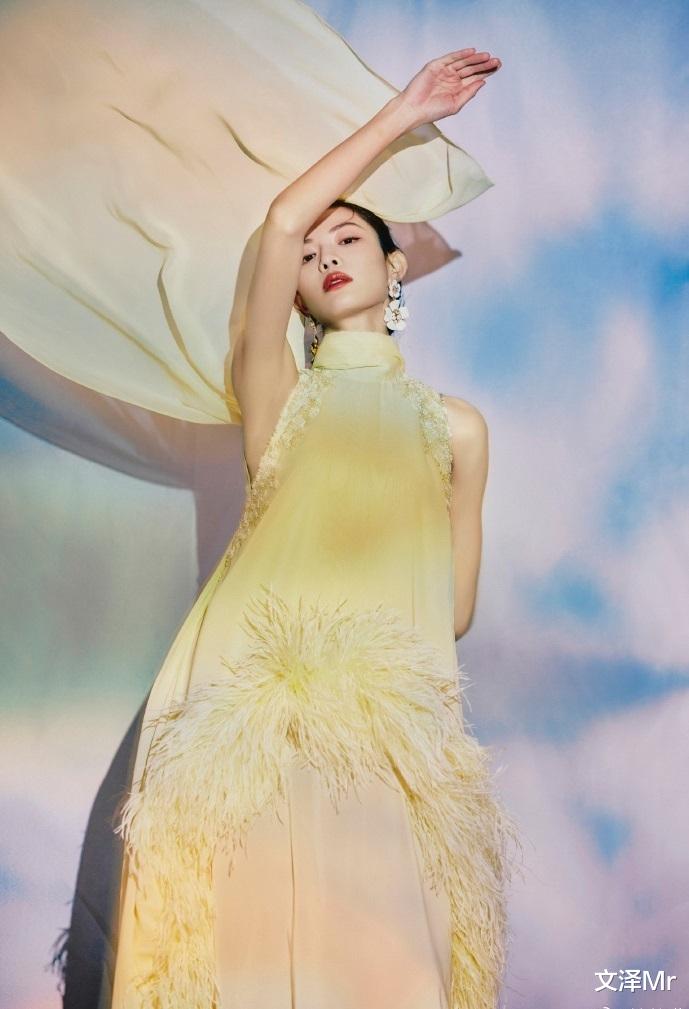 一只手臂高高扬起,纱裙也随之飞扬起来。 鹅黄色的纱裙上点缀着羽毛,随着她的动作轻轻摇曳,仿佛为她增添了一对灵动的翅膀。 她的每一个动作都仿佛是精心编排的舞蹈,与这身纱裙完美融合,将她的身材优势展现得淋漓尽致,也让观众看到了她在舞台上的超强表现力。
