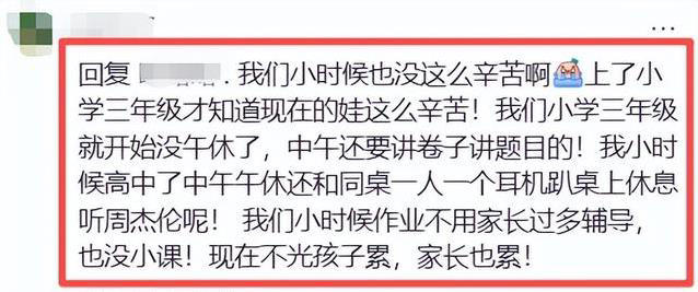 有位家长提到,孩子才上小学三年级,中午基本没时间休息,老师会抓紧每段时间讲题、做练习。她回想自己小时候,放学写完作业就能出去玩,现在却要全程陪着学,感觉自己像个“学习助理”。