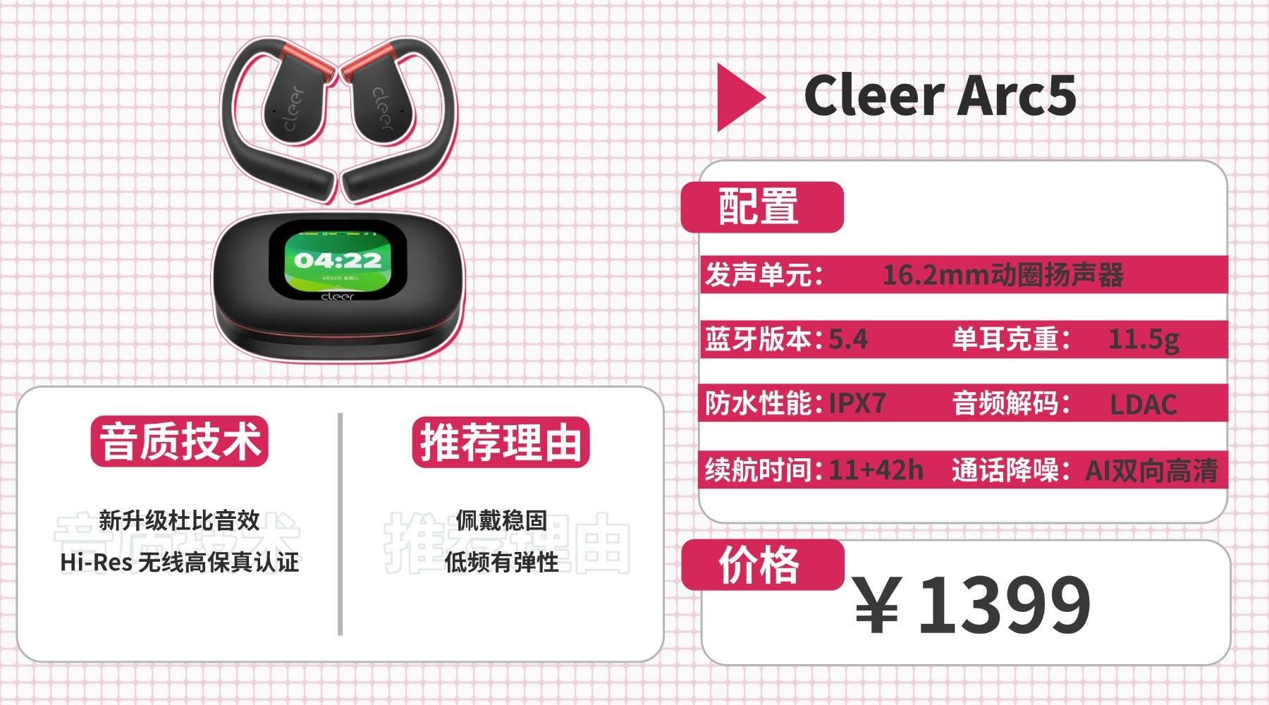 功能配置:支持LDAC、AI通话降噪和恒听模式,续航12h+60h,防水等级IPX7。搭配AMOLED触控屏和APP,功能丰富,适合运动及日常使用。整体配置全面,但价格高、重量偏大。