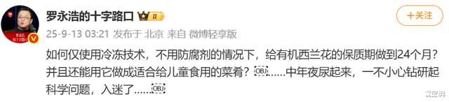 13日凌晨三点多,在直播结束后几个小时,罗永浩忍不住在微博发问:“如何仅使用冷冻技术,不用防腐剂的情况下,给有机西兰花的保质期做到24个月?并且还能用它做成适合给儿童食用的菜肴?”