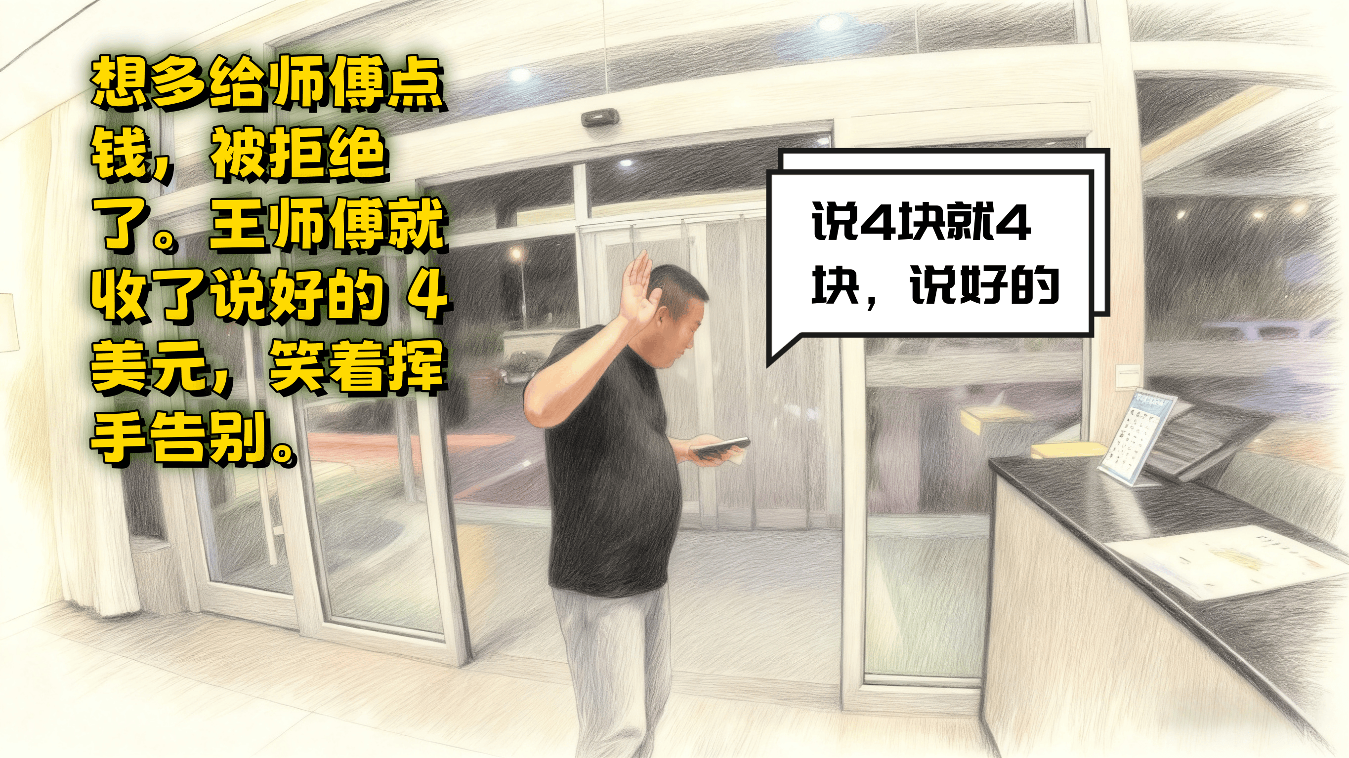 想多给师傅点钱,被拒绝了。王师傅就收了说好的 4 美元,笑着挥手告别。