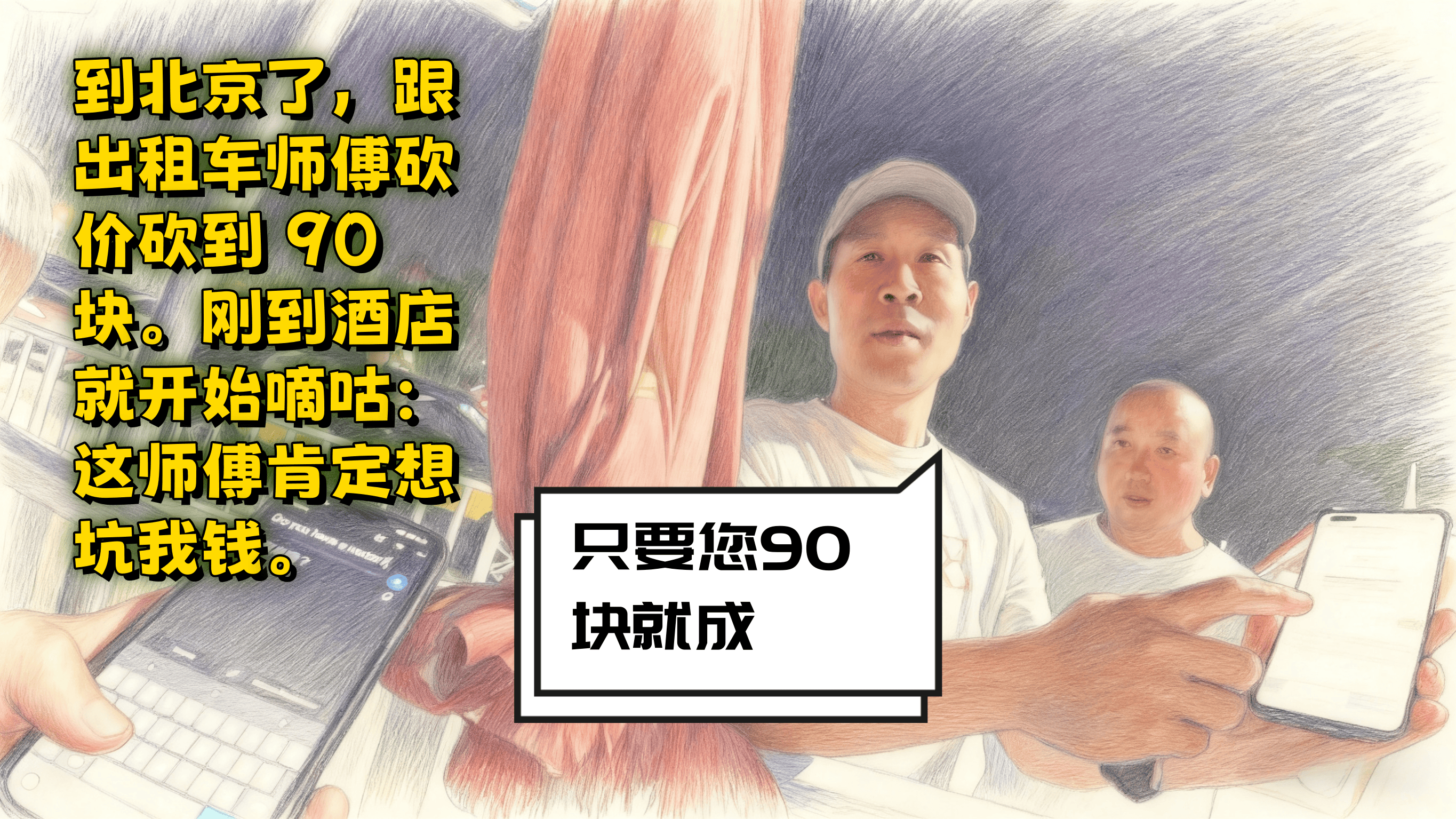 到北京了,跟出租车师傅砍价砍到 90 块。刚到酒店就开始嘀咕:这师傅肯定想坑我钱。