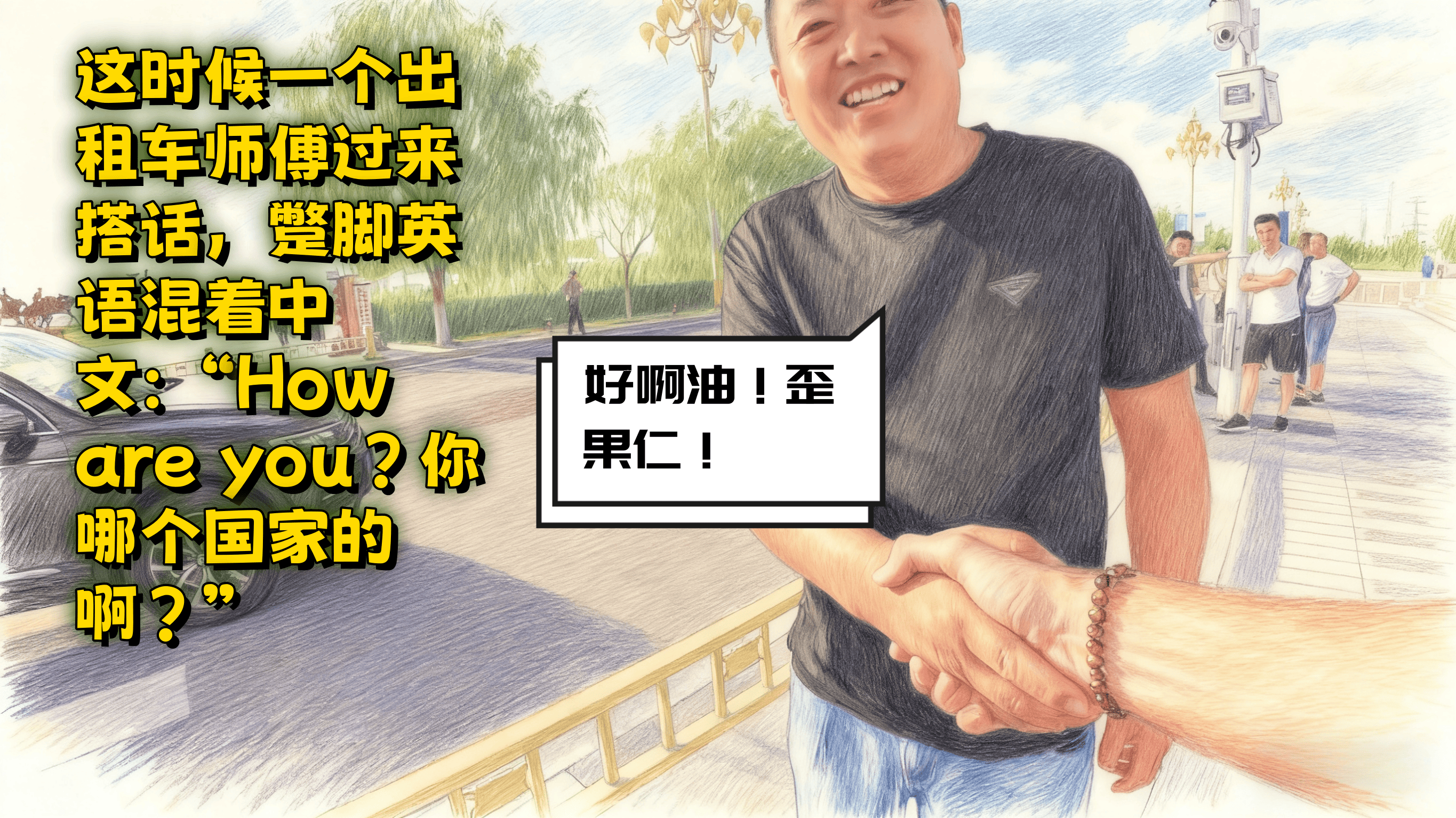 这时候一个出租车师傅过来搭话,蹩脚英语混着中文:“How are you?你哪个国家的啊?”