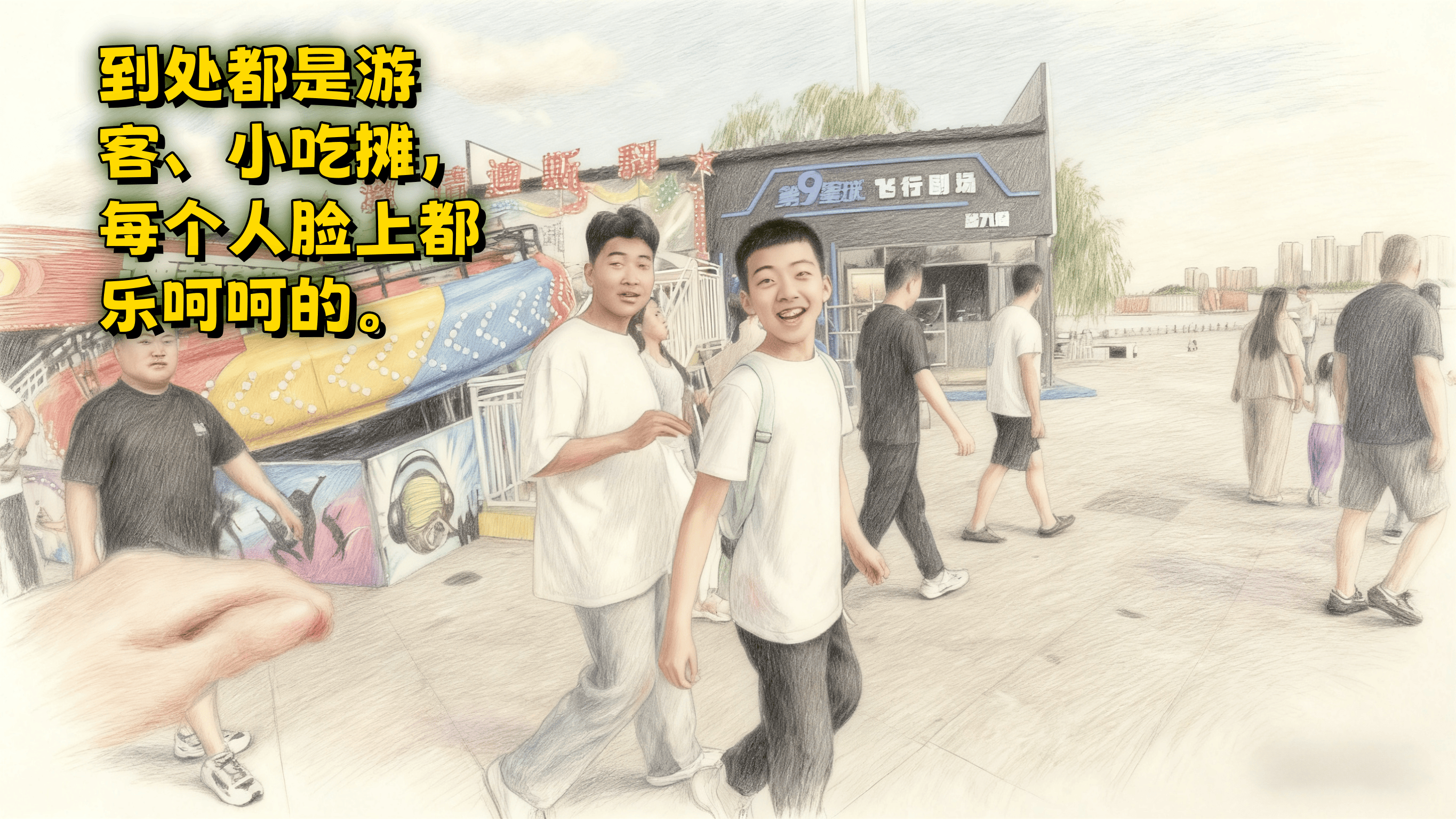 到处都是游客、小吃摊,每个人脸上都乐呵呵的。
