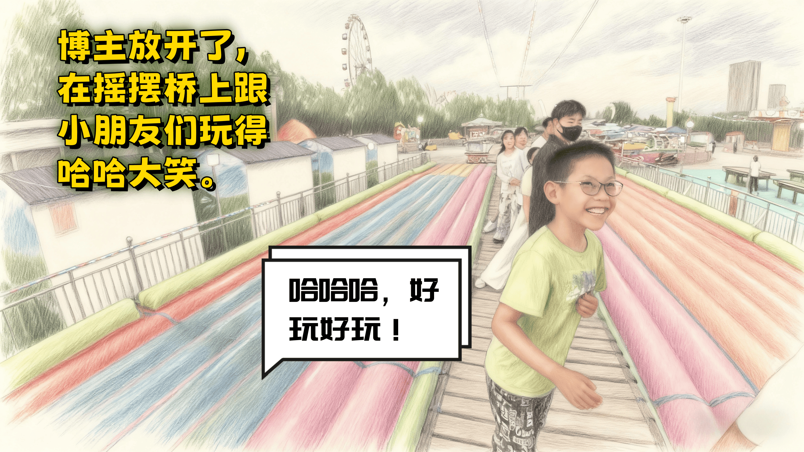 博主放开了,在摇摆桥上跟小朋友们玩得哈哈大笑。