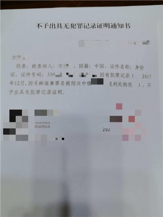 2017年,诸暨市检察单位以寻衅滋事罪对其公诉。法院认为,方女士在信访事项终结、经处罚后,仍多次赴京重点地区起哄闹事,情节严重,判处有期徒刑一年四个月。该判决已生效,2025年12月方女士申请无犯罪记录证明时,被诸暨市公安单位以有寻衅滋事罪记录为由拒绝。