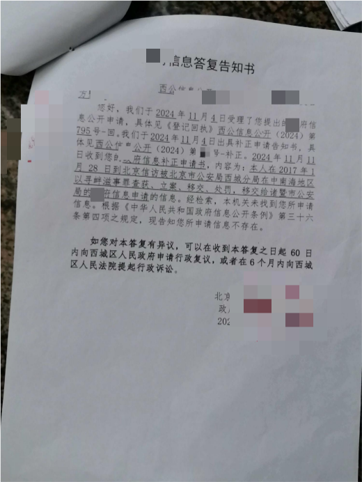 方女士此前多次向北京西城分单位申请同类信息:2024年11月4日提交三份申请,均被以“未找到所申请信息”不存在告知书;2025年8月16日再次申请,仍以“信息不存在”答复。其申请复议后,2025年10月17日复议机关维持北京公安西城分单位决定。