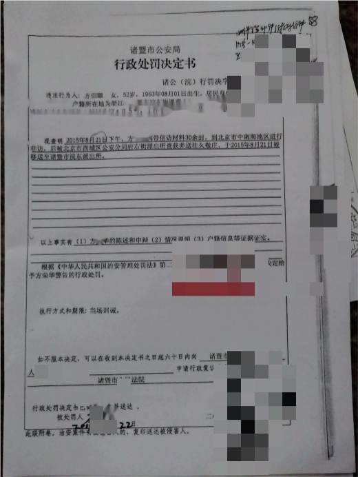 2015年8月至2017年1月,方女士四次赴京信访并在中南海地区停留(2015年8月17日、2017年1月27日—29日),诸暨公安单位随后分别于2015年8月22日作警告处罚,2017年1月30日作行政拘留十日处罚。