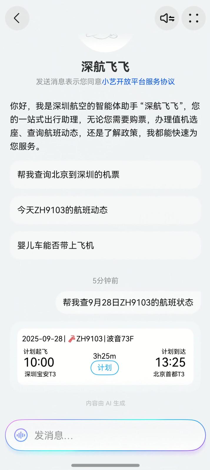 比如昨天朋友来北京,发我航班号ZH9103让我去接。我没在各种网站或App里费心查找,而是直接打开升级到鸿蒙5的华为Pura 70,找到深航飞飞Agent,输入指令:“帮我查9月28日ZH9103的航班状态”。