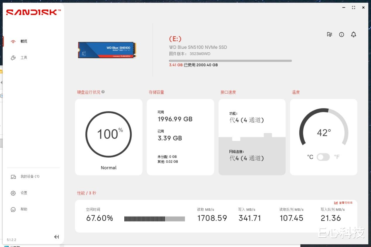 闪迪官方SSD控制管理软件SANDISK Dashboard也更新至最新版本,可完全识别SN5100等闪迪固态硬盘。通过该软件,用户可以方便地完成监控固态硬盘的工作状态(温度、读写速度等)、更新固件等操作。