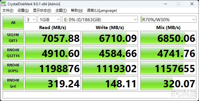 在CrystalDiskMark 9最新版测试软件中,这款固态的成绩与官方数据几乎一致。且无论顺序写入/读取,或是随机写入/读取(IOPS)的成绩都十分理想。它将在AI应用、多媒体创作、创意设计及3A游戏等使用场景中为用户助力。