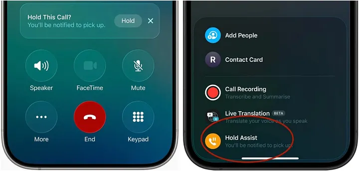 6、保持等待助手(Hold Assist)当我们被客服放在等待音乐里时,手机放着响着会持续消耗电量,iOS 26 的 Hold Assist 能识别等待音乐并建议切换到保持静音的模式,通话依旧保持连接,等到真人接入时手机再响,这样既省电又不耽误事,自动识别可以在 设置 ⚙️ < 应用 < 电话 中开启。