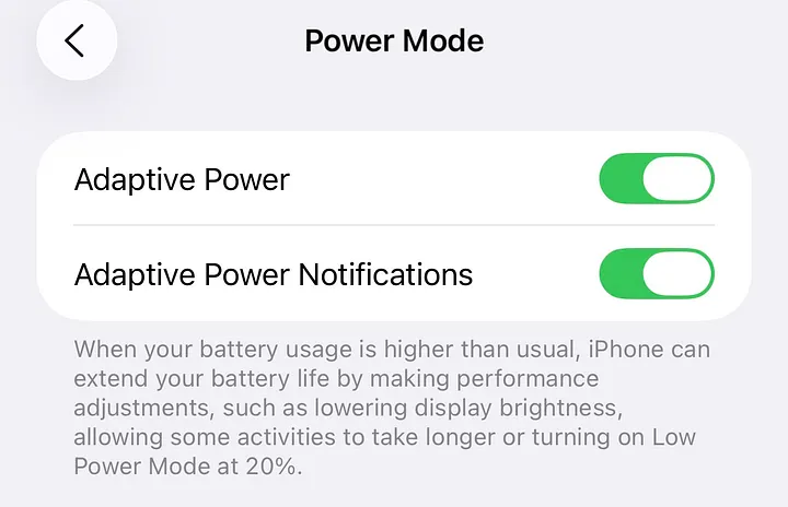 4、启用自适应省电自适应省电相当于让低电量模式自动化运行,我们平时只有到 20% 时才手动开省电,但开启自适应省电后,系统会在判断电量使用偏高时提前把一些东西降一降,比如把屏幕亮度压低、减少实时刷新、延长某些任务的执行时间,甚至在必要时自动降到低电量模式,从而让电池续航更稳;