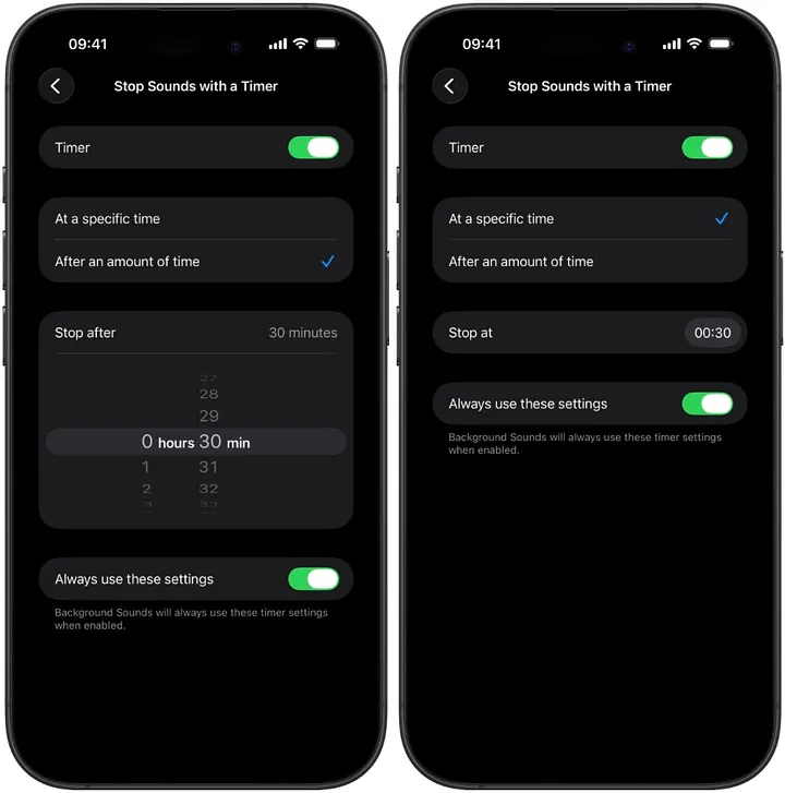 10、用定时器停止背景声音如果你喜欢用系统的背景声音助眠,在 时钟 app 里设个定时器,让“结束时停止播放”或在无障碍里的背景声音设置中打开“用定时器停止”功能,这样声音会在设定时间后自动停止,手机就不会通宵开着在后台消耗电量;
