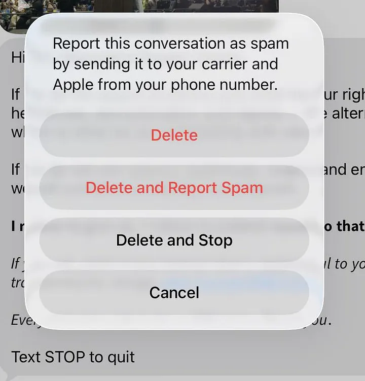 7、删除并阻止垃圾短信每条信息都会触发提示音、振动和屏幕唤醒,垃圾短信尤其烦人,iOS 26 新增了“删除并阻止”选项,遇到可疑短信时点它,系统会尝试用 STOP 退订或把发信者标为垃圾,从此类似的消息就不会再打扰我们,也不会再为这些消息浪费电力;