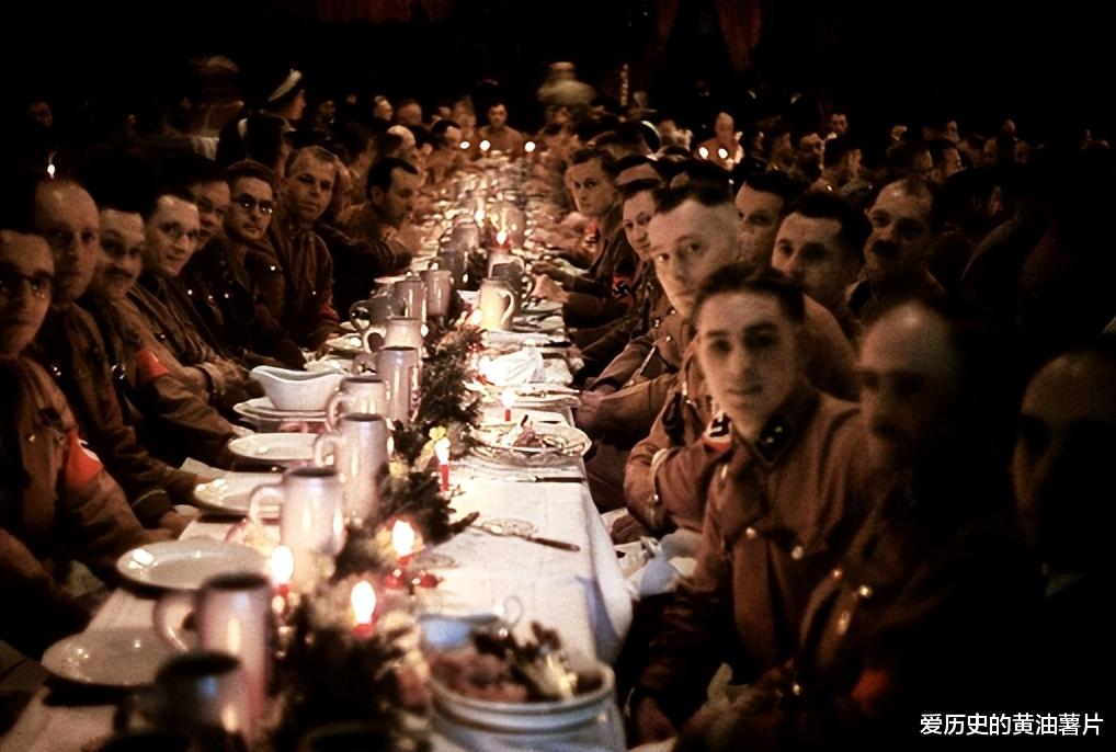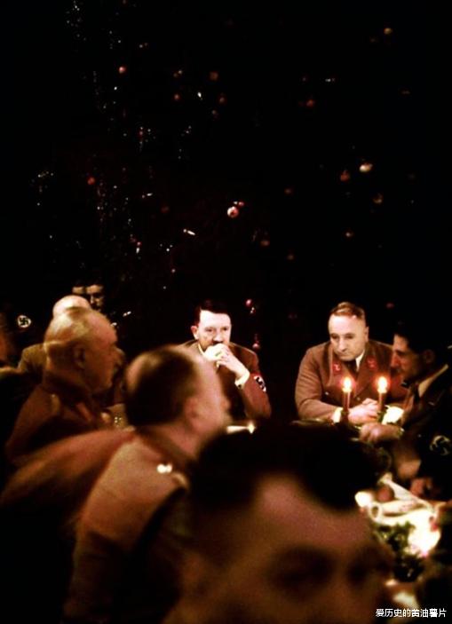 希特勒紧握双拳,神情凝重地望向餐桌那头正共进圣诞晚餐的数十名纳粹士兵。
