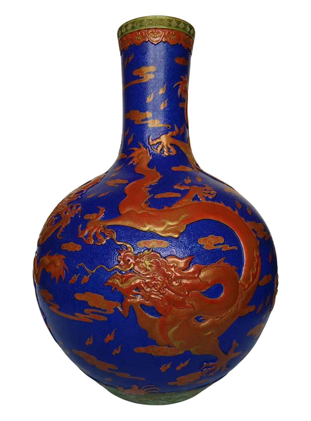 蓝釉描金云龙纹天球瓶的典型造型挺拔沉稳,直口、长颈、球形腹、圈足,整体线条优雅流畅,富有皇家气派。