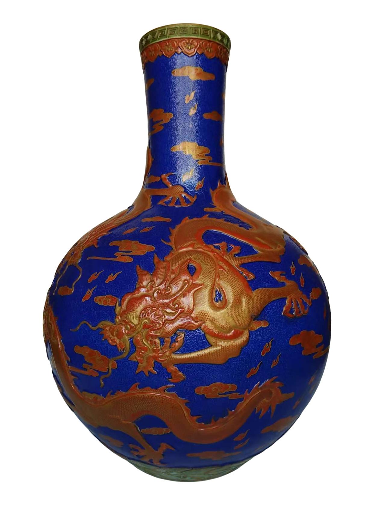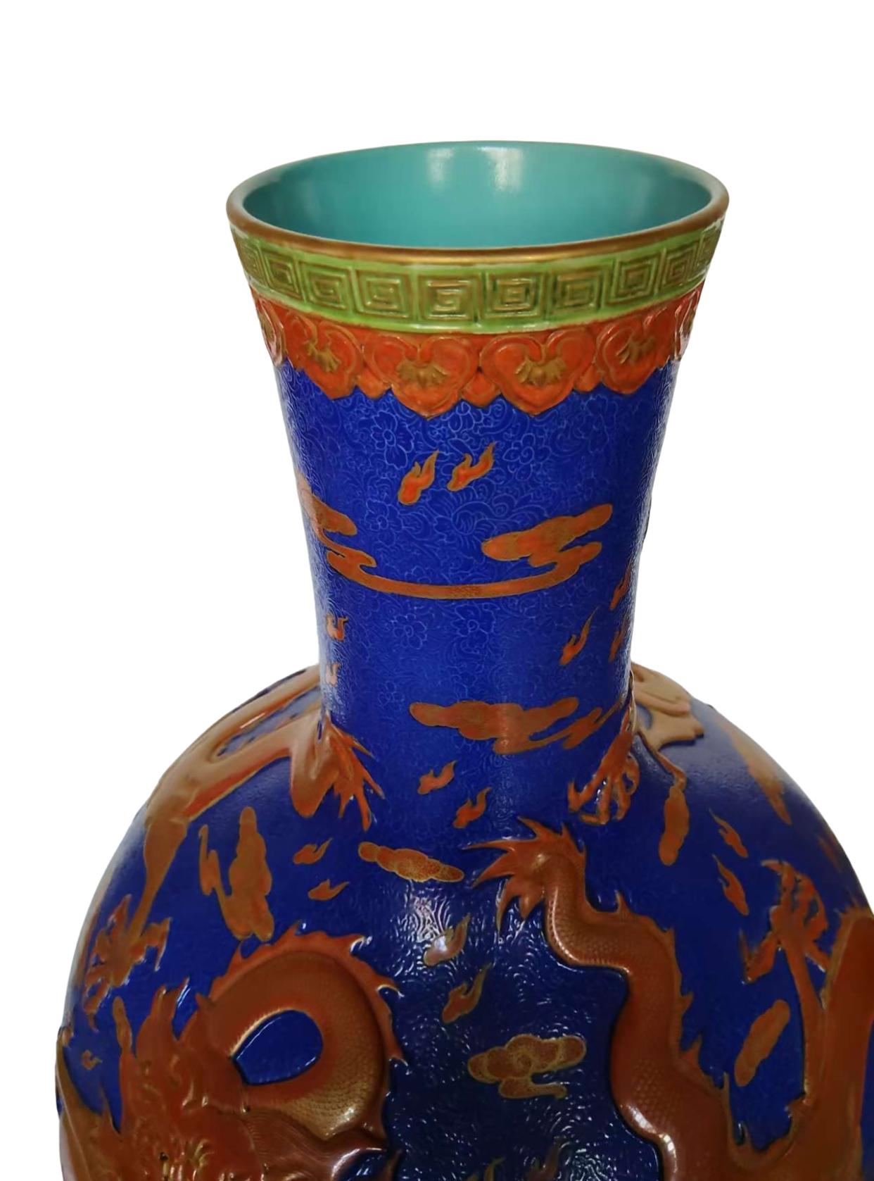 瓶身以深邃华贵的蓝釉为地,其上浮雕金彩巨龙,龙身矫健灵动,鳞片、须发分毫毕现,祥云、火焰纹环绕其间,尽显皇家威仪。天球瓶的器型本身就具大气磅礴之态,结合乾隆朝擅长的“轧道工艺”(蓝釉下隐约可见的纹饰肌理)与金彩描饰,工艺繁复至极。