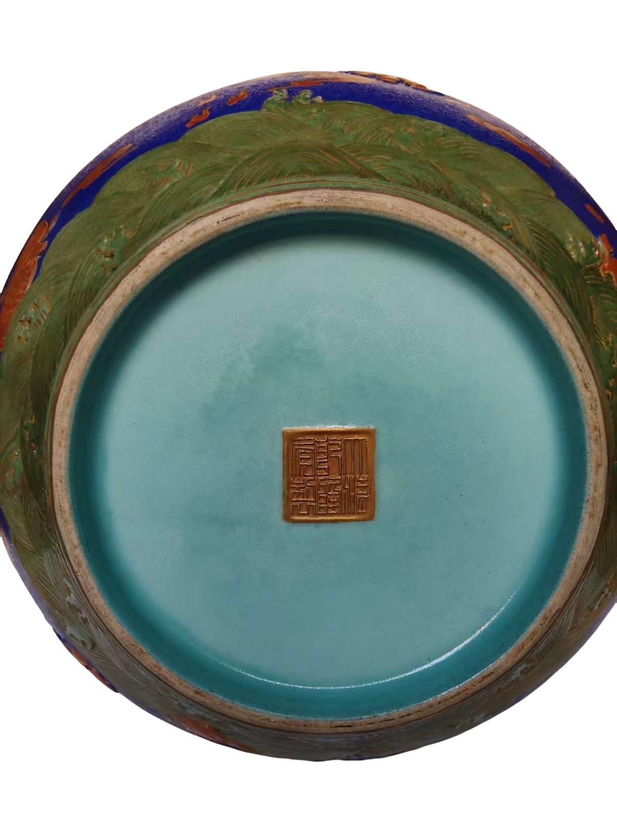 它不仅是制瓷技艺的集大成者——蓝釉的匀净、浮雕的立体、金彩的华贵完美融合,更承载着乾隆朝对“龙文化”的极致推崇,是皇权与艺术的双重载体。观之,仿佛能窥见当年宫廷御窑的精工巧思,堪称乾隆御瓷中彰显盛世气魄与工艺巅峰的传世珍品。